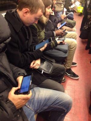 Ну на улице все таки люди в основном идут куда-то, а вот в метро после работы пока едут и стар, и млад - все в телефонах/плашетах/электронных книгах. Прям каждый второй в гаджете...