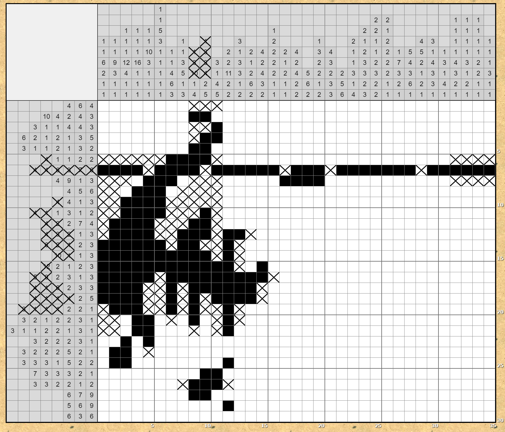 Хороший сложный кросс. Придираться к картинке считаю неправильным, потому что в этом деле главное - собрать самому, без подсказок, и чтобы всё сошлось. Тогда и удовольствие :) А уж что получилось - не особо важно. Я вообще картинку рассматриваю только тогда, когда все клеточки закрашены.
