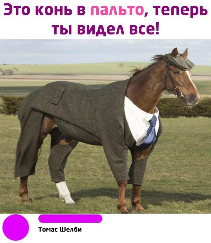 По всему городу афиши: "Впервые!!! Говорящая лошадь!!! Только три дня!" Народ валом валит в цирк. На арену выходит кляча - кости торчат, на голове соломенная шляпа с прорезями для ушей, глаза слезятся... Под бой барабанов ее на лонжах поднимают под купол цирка. Барабаны смолкают, в полной тишине отстегиваются лонжи и лошадь шмякается на арену. Поднимает грустную морду: "Б@я, когда же я все-таки сдохну?!"