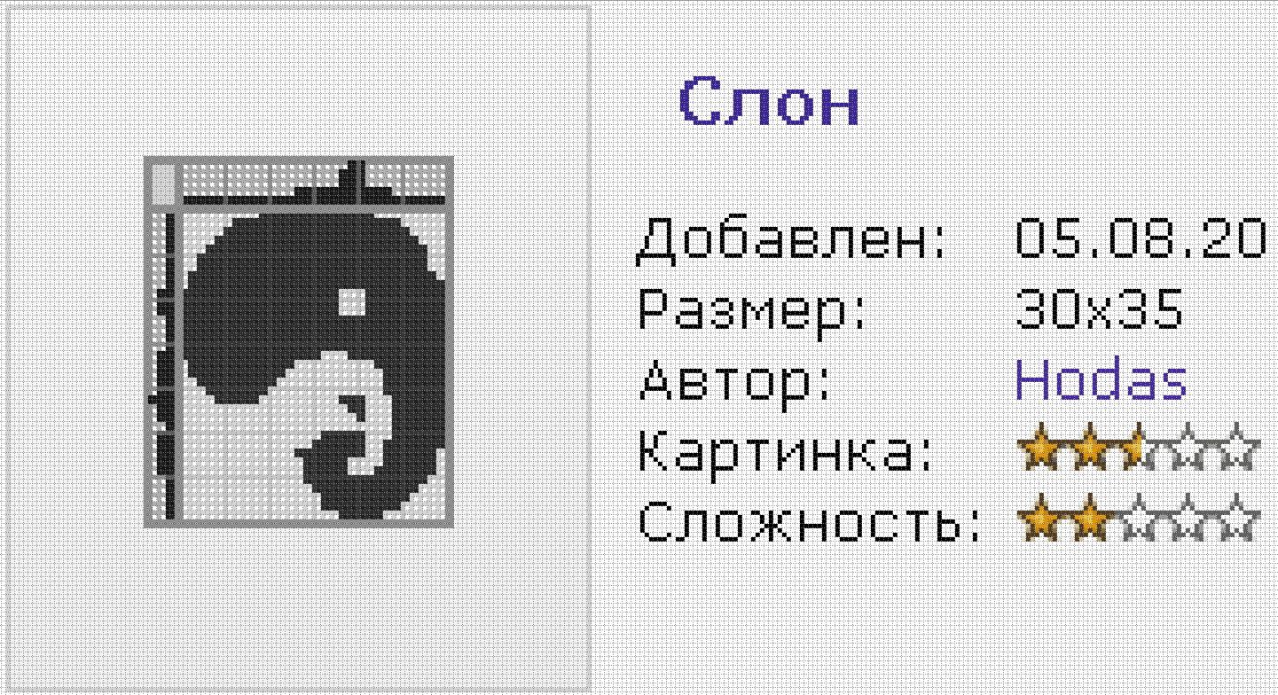 | Размер: 25x25 | Картинка: | Сложность: | Добавлен: | 25.08.20 | Автор: Hodas |