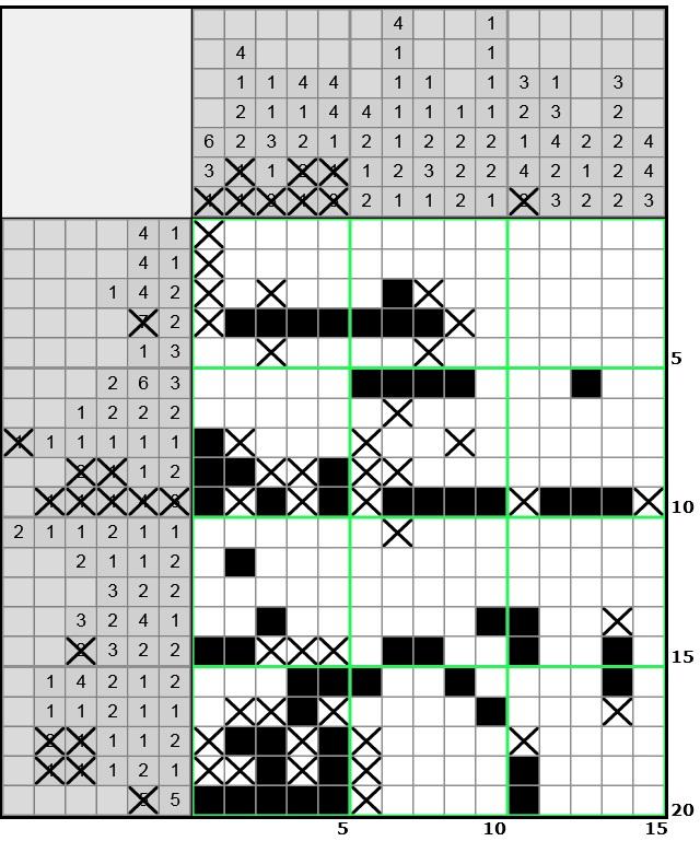 ответитьНа удивление самой себе решила за 25:19, причём пару раз отвлекалась. Сразу решила не торопиться, просчитать все ходы, где 100% будет закрашена клетка и где не будет. И в итоге всё сложилось! Я довольна собой и этим замечательным осьминожком с шляпой.