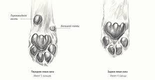 У кошки(кота) по пять пальцев на передних лапах и по четыре - на задних. Здесь, наверное, изображена задняя лапа.))) Вам проще, возьмите своего кота и посчитайте.:-)))