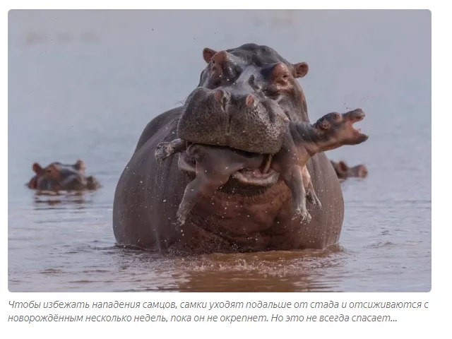 Самцы без самок и территорий безжалостно убивают чужих малышей. Не удивительно, что при малейшей опасности самка впадает в неистовую ярость. Мамочкам приходится следить за своими детишками в оба глаза, так как перед яростной четырёхтонной махиной малыш абсолютно беззащитен. Для некоторых самцов этот варварский метод — единственный способ сесть на два стула: и с самкой спариться, и перекусить