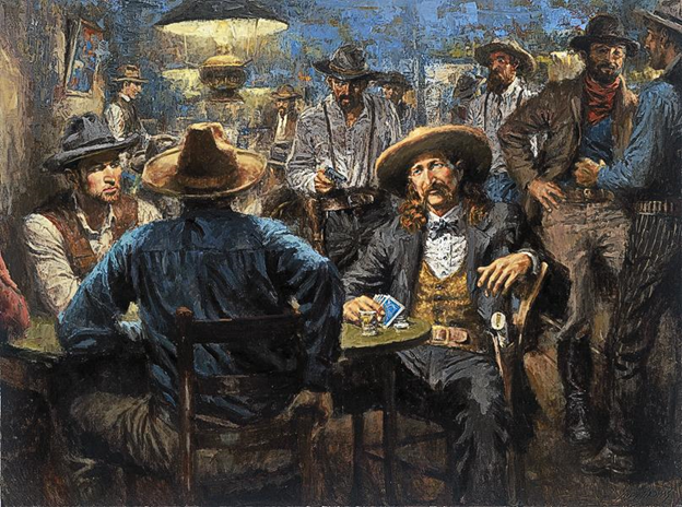 ответить2-го Августа 1876 г Дикий Билл Хикок играл в карты в салуне Нуттала и Манна №10 в городе Дедвуд, территория Дакота. Он сидел спиной к залу. Он сильно проигрывал. Сидевшему рядом Биллу Масси наоборот везло. В 4 часа 15 минут после полудня в салун зашел Джек Мак Колл. Он достал револьвер Кольта модели 1873 45-го калибра и с криком: “Будь ты проклят! Получи!” выстрелил Дикому Биллу Хикоку в затылок. Пуля прошла голову Хикока и попала в запястье Масси. Последний сначала даже подумал, что в гневе от проигрыша в него выстрелил Хикок.