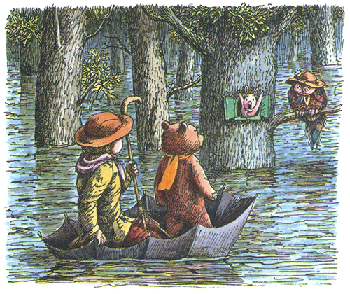 Да, Кристофер Робин вдруг понял, что это возможно. Он открыл свой зонтик и опустил его на воду. Зонтик поплыл, но закачался. Пух влез в него. Потом они оба сели в зонтик, и зонтик больше не качался.