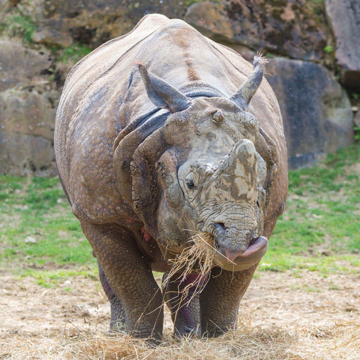 Его единственный (в отличие от других видов) рог размером всего 20 см, а самки и вовсе безрогие. Да и эти рога ЯН используют в основном не для нападения или защиты, а чтобы счищать с тела грязь, в которой они очень любят валяться.