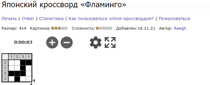| Размер: 4x4 | Картинка: | Сложность: | Добавлен: | 16.11.21 | Автор: Reegh |
