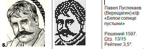 Дорогие друзья, это 5-й кроссворд мини викторины - «Актёр (Кто это?)». Благодарю всех, кто, не считаясь со временем, принял участие в викторине и прислал отзывы. По данному персонажу, всего прислано 15 отзывов, из которых 13 верно определили загаданного актёра, с чем я всех и поздравляю. Действительно этой картинкой я хотел напомнить актёра Павла Луспекаева в роли таможенника Верещагина из к/ф «Белое солнце пустыни». Следует отметить, что данному персонажу принадлежит много «крылатых фраз», приведенных в отзывах. Показаны также фрагменты фильмов с участием этого актёра, причём не только в этой роли, но и в других ролях. Приведены выдержки из биографии П. Луспекаева и даже фотография памятника ему. Большое спасибо всем за всё это. Только вот рейтинг, почему то всего лишь 3,5*, такой же, как у предыдущих персонажей: Шуры Балаганова и Огурцова, хотя отзывы о них гораздо скромнее.