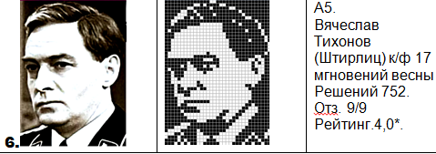 Дорогие друзья, это 6-й кроссворд мини викторины - «Актёр (Кто это?)». Благодарю всех, кто, не считаясь со временем, принял участие в викторине и прислал отзывы. По данному персонажу, всего прислано 9 отзывов, и все 9, с некоторыми оговорками, ы общем то верно определили загаданного актёра, с чем я всех и поздравляю. Действительно этой картинкой я хотел напомнить актёра Вячеслава Тихонова в роли Штирлица из к/ф 17 мгновений весны.