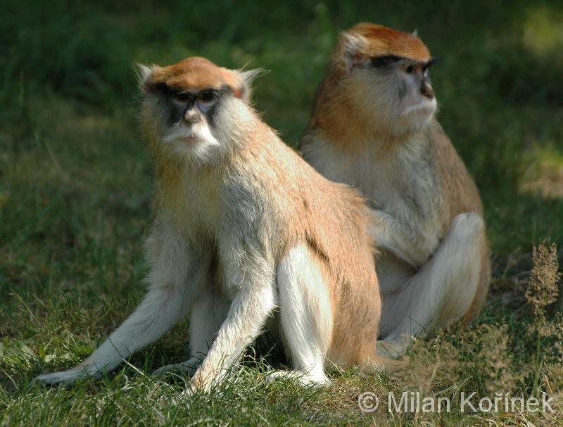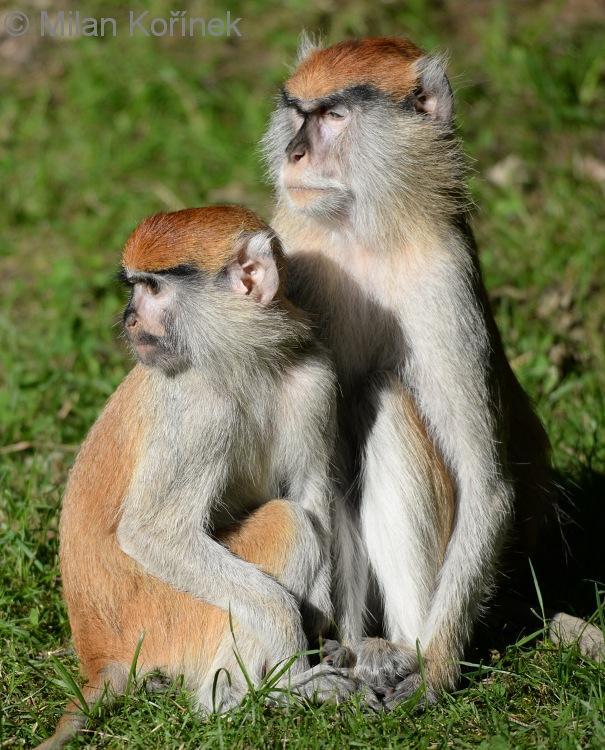 1-3. Вожак отвечает за то, чтобы вовремя заметить любую приближающуюся опасность : леопардов, гиен и пр. Он поднимается на ноги и выглядывает из высокой травы, или взбирается на дерево, чтобы осмотреться. Если самец видит хищника, то издаёт нежные, щебечущие звуки, которые тут же настораживают всю группу. Обезьяны бесшумно прячутся в траву, в то время как вожак совершает отвлекающие манёвры: с шумом прыгает на ветках, а потом бросается в направлении, противоположном тому, в котором укрылись самки и детеныши, уводя врагов за собой.