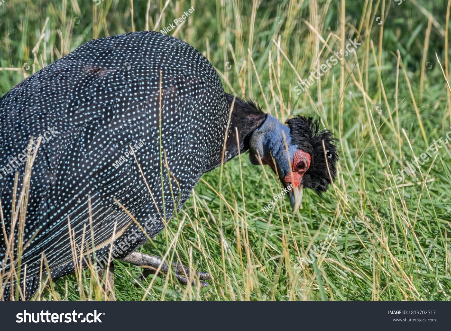 Остальная голова голая, серо-голубого цвета с красными "очками", на шее - черное боа. Остальное оперение черное в светлую крапинку. На лапах - шпоры (Причем это единственная цесарка со шпорами)