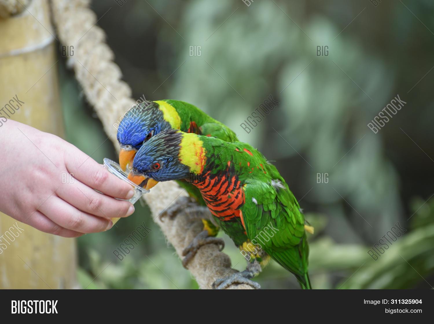 Основная окраска оперения зеленая, украшенная, - как следует из названия - яркими мазками фиолетово-синего, ярко-красного, желтого и оранжевого цветов.