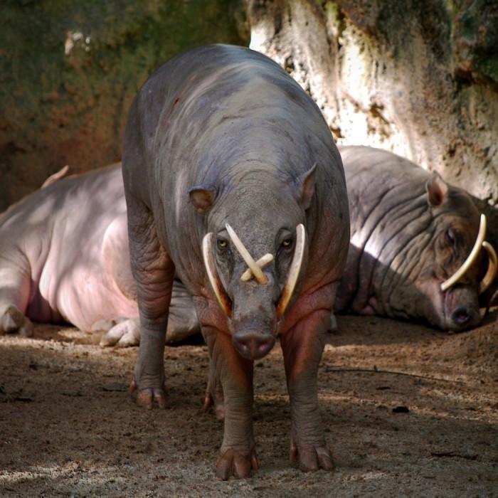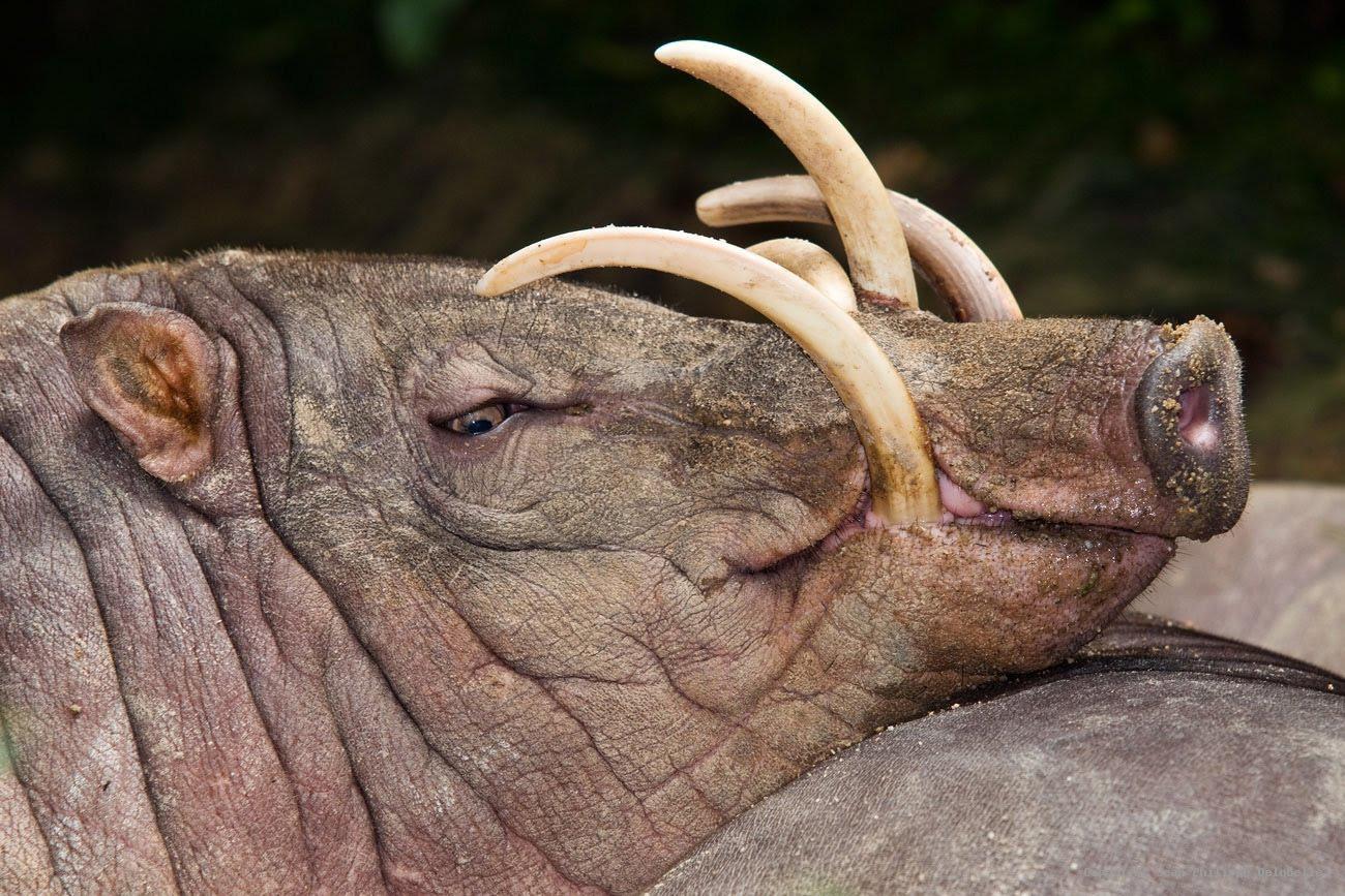 ответитьЭта удивительная свинья обитает в мангровых и тростниковых зарослях индонезийского о-ва Сулавеси и еще парочки близлежащих о-вовЗамечательная морда. А уж клыки!)))