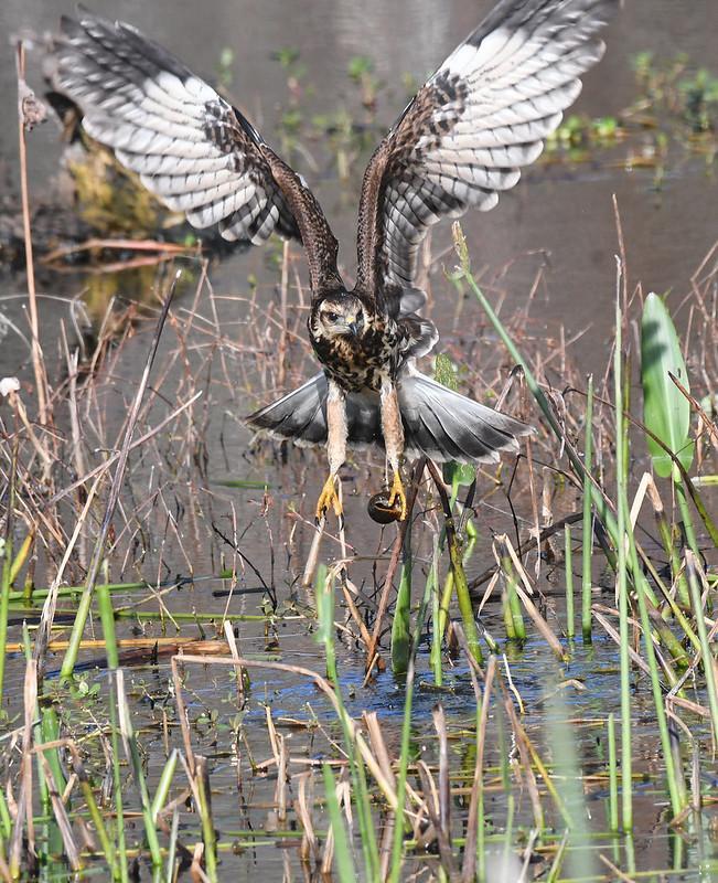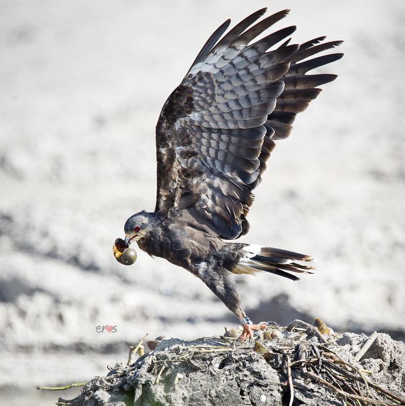 КС парят над болотом, а затем выставляют лапы с когтями вперед, погружают их в воду, отрывая улитку от стебля растения. В этом случае оперение не намокает, так как моллюски никогда не находится глубже 15 см. Схватив добычу, КС возвращается в гнездо, чтобы достать мягкое тело заостренным клювом. Но может вытащить и во время полета.