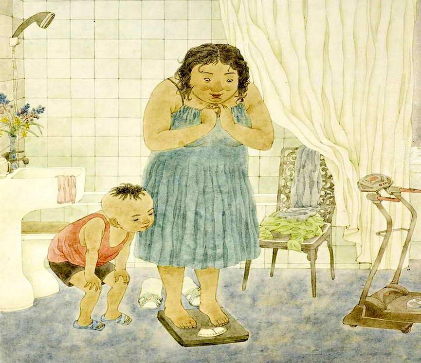 Спасибо за знакомство с интересным китайским художником. Насколько я поняла, многие его работы пронизаны добрым юмором, и та, которая послужила вам образцом для подражания под названием "Я похудела"- тоже))