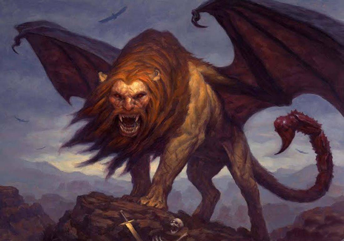 Изображая это мифологическое чудовище, автор учел практически все его особенности: размером с лошадь, с телом льва и хвостом скорпиона. Иногда в других интерпретациях мантикора изображается с головой человека. В современных фэнтези мантикора часто крылата.
