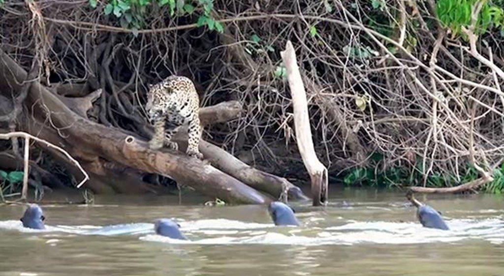 Здесь несколько таких выдр из бразильского заповедника Пантанал прогоняют от реки настоящего ягуара.