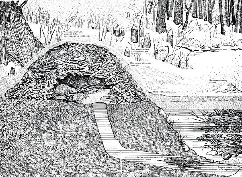 Жилые помещения - внутри хаток, но выше поверхности воды, а вход всегда подводный: чтобы попасть в дом, надо нырнуть. (Ф. 7-8)