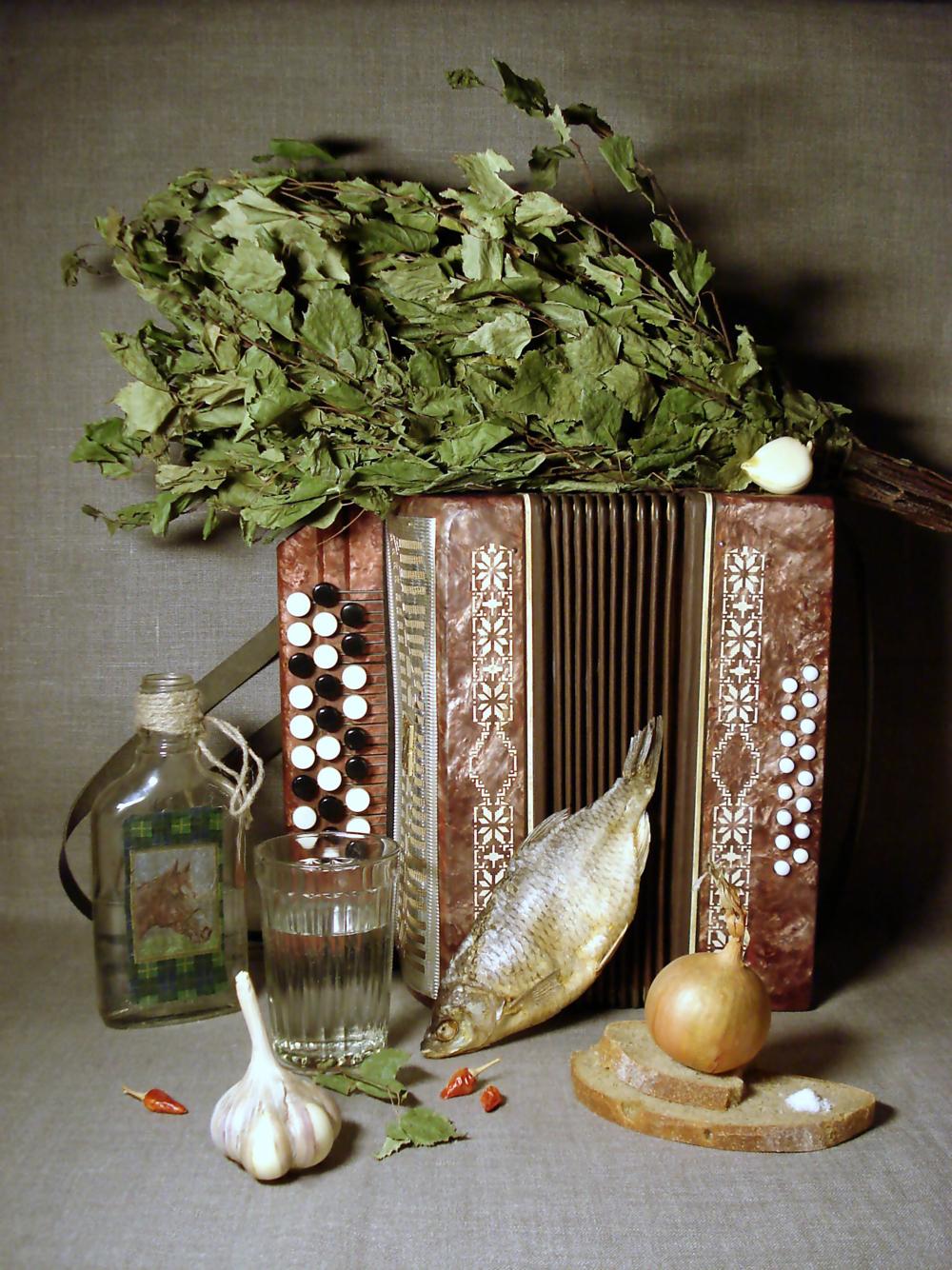 Баня, водка, гармонь и... э-э-э... лосось?
