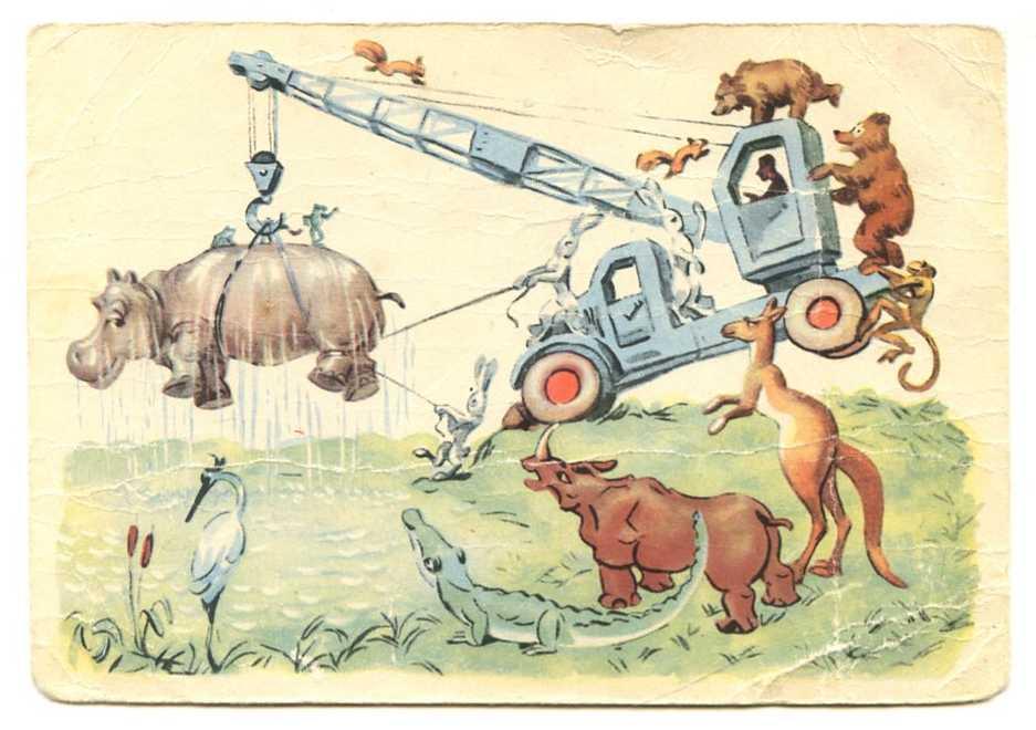 ответитьКак я понимаю, автор "ояпонил" старую открытку Л.Эппле "Телефон"(К.Чуковский). (Ох, нелегкая эта работа: из болота тащить бегемота!)