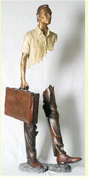 ответить...Самая впечатляющая часть работ – отсутствующая у них средняя часть. Сразу же появляется вопрос: «А как, собственно, в воздухе держится верхняя половина тела?». Секрет в конструкции каркаса скульптуры. Обычно верхняя и нижняя часть скреплены по центральной вертикальной оси, но Бруно Каталано соединяет части своей работы с помощью ручки дорожной сумки. Благодаря тому, что материалом выступает крепкий металл, обеспечивается прочность скульптуры.