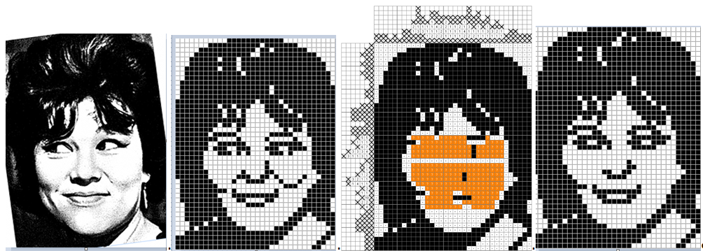 Добрый день. Первоначально этот рисунок был «чуть изменён» (см. ниже 2-й рис.). Я нарисовал его по портрету, представленному на 1-м рис. По-моему, получилось немножко более узнаваемо. Однако, на него пришёл ответ о не решаемости кроссворда. На 3-м рис. оранжевыми квадратиками показаны места, где при имеющихся числах чёрные квадратики могут быть размещены в двух и более вариантах расположения. Сначала я посчитал, что тут уж ничего не поделаешь и отложил этот кросс. Но сейчас настало время, что я просто не нахожу, что бы ещё нарисовать. Вот я и обозлился сам на себя; «неужели я не смогу одолеть эту незадачу?». Поэтому я вернулся к этому кроссу, Попереставлял квадратики, где-то добавил, где-то убрал и получился вариант, показанный на 4-м рис. Немного уменьшилась узнаваемость, но зато прошёл тест на «решаемость». Обратно уже не отыграешь. Да и всё равно в последнее время стала уже традиционной оценка 3.5*.