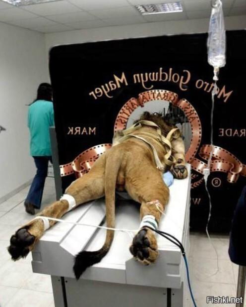это шутка. неужели вы не видите что на фото томограф и усыпленный лев, которому процедуру проводят. просто в фотошопе прилепили логотип МGM