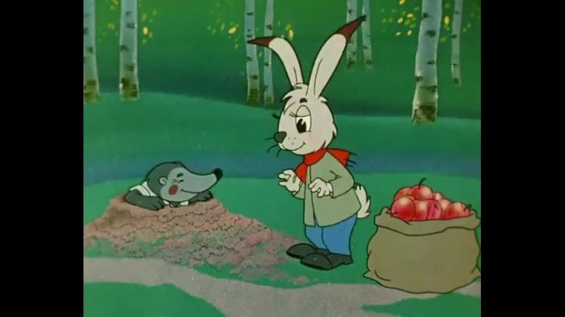 Очень милый крот. Похож на того, из "Мешка с яблоками", которого заяц яблоками угостил. А крот потом целую гору овощей-корнеплодов его семье подарил.