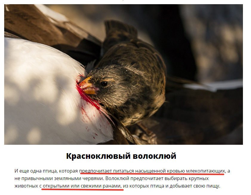 Я по этому поводу прочитала другую информацию. Эти волоклюи или буйволовы скворцы вынуждены проклевывать кожу животного, чтобы достать личинок насекомых, которые(насекомые) отложили их(личинки) животному под кожу. Естественно, повреждение кожного покрова сопровождается некоторым кровотечением. Возможно, некоторые наблюдатели видели это и сделали не правильные выводы)
