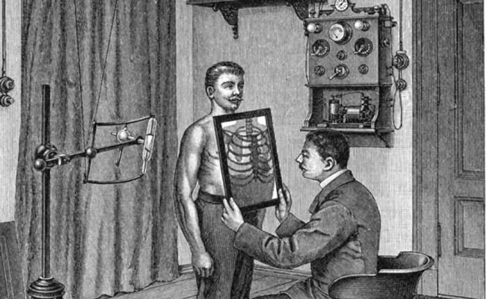 9. Врач смотрит рентгенограмму грудной клетки пациента, начало ХХ века.