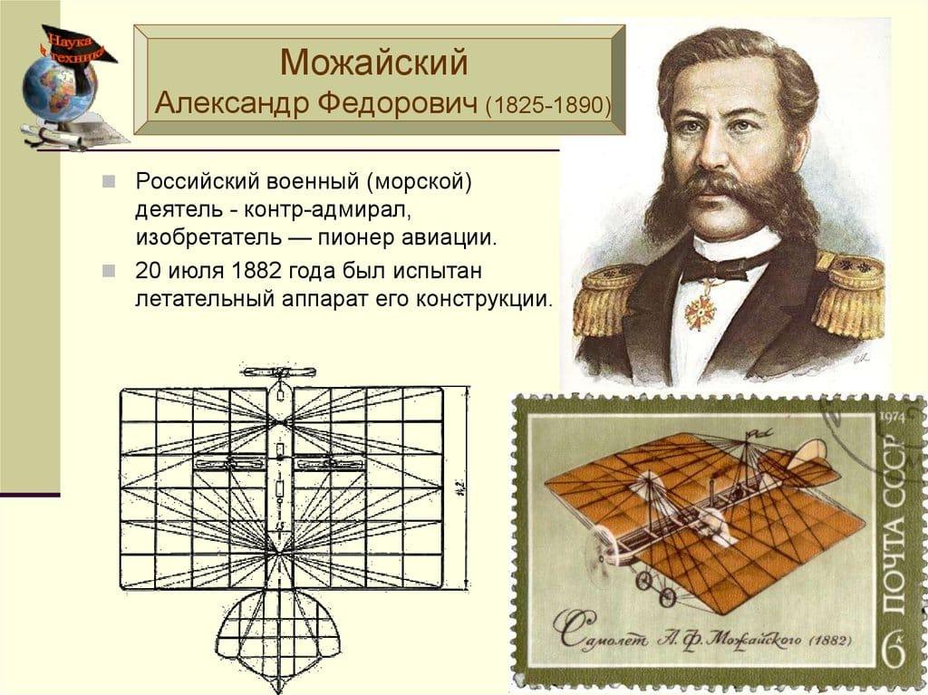 Тем не менее, Можайский стал первым русским изобретателем, создавшим натурный самолёт, который был тяжелее воздуха. Это первый в мире самолёт с человеком на борту, оторвавшийся от земли.