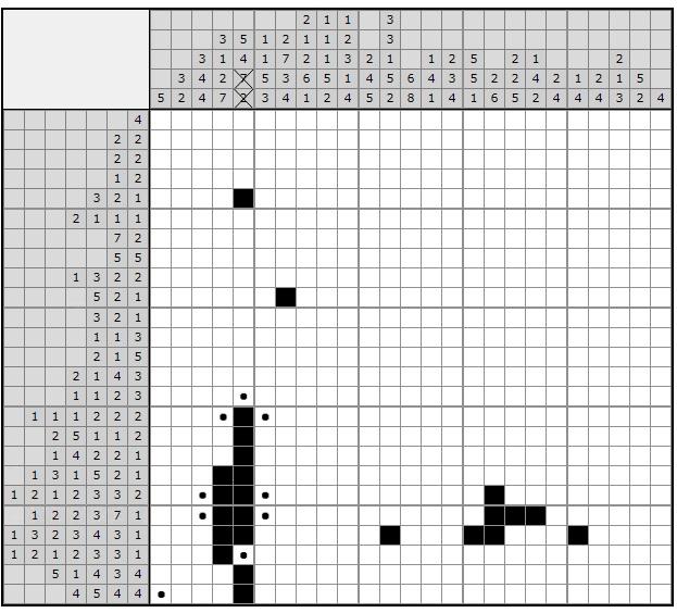 Обратите внимание на пятую строчку снизу. Если при сложившейся ситуации начать отсчитывать возможные заполнения слева направо, то будет видно, что трехклеточную полоску от семерки можно продлить на 1 клеточку вправо. И сразу поставить крестик (или точку) в явно пустой клетке на пересечении последней строки и 20-го столбца слева (Ф.1)