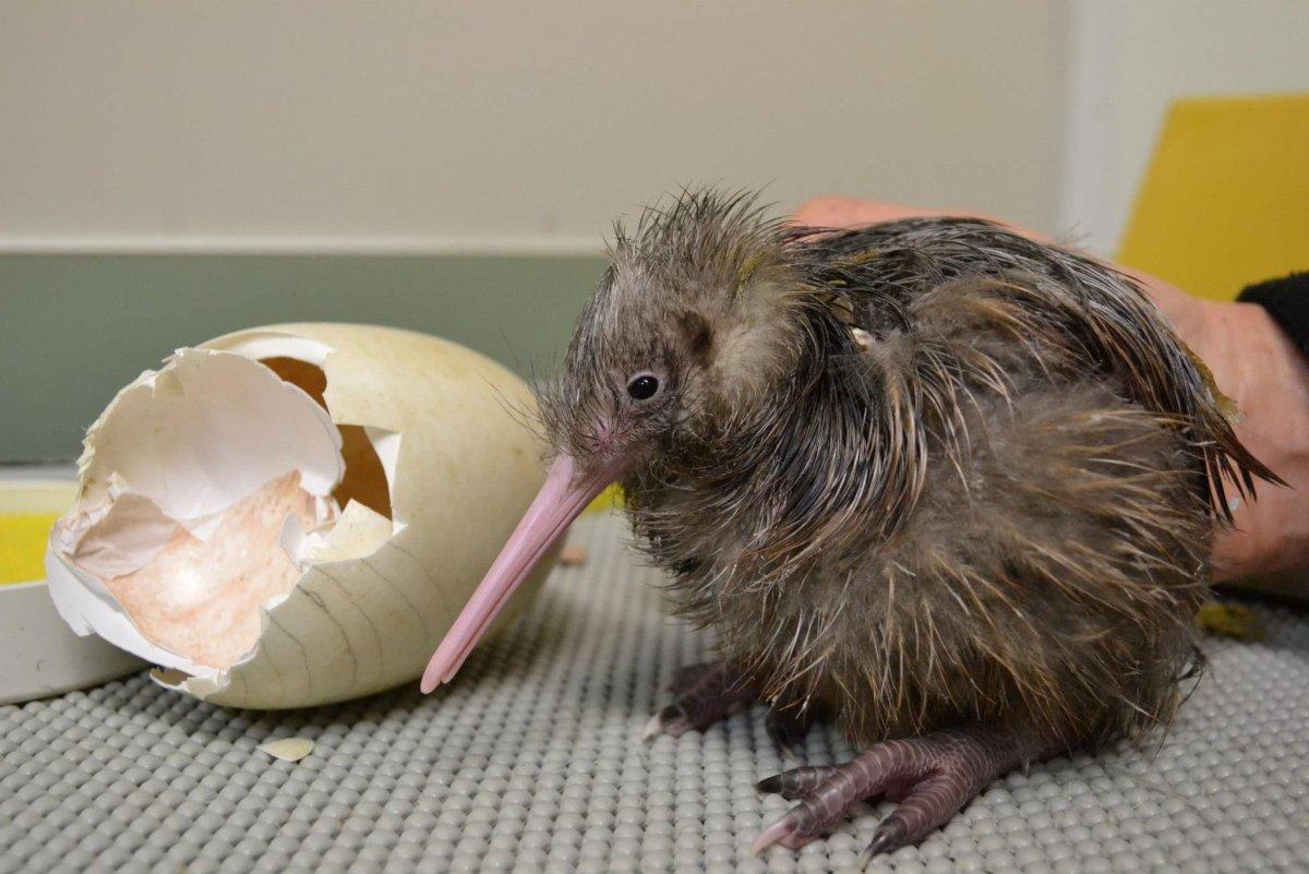 Скорлупа у яйца настолько толстая, что птенец колупает её пару дней, чтобы вылезти. Птенцы вылупляются похожими на взрослых птиц, у них нет детского пушка, сразу взрослое оперение. Родители за ним не ухаживают совсем. Первые дней 5 он сидит в гнезде и думает «и чё теперь делать…». Потом запасы в организме, что он накопил в яйце, подходят к концу. И чувство голода заставляет покинуть гнездо и исследовать мир. Неудивительно, что 90% птенцов киви гибнет.
