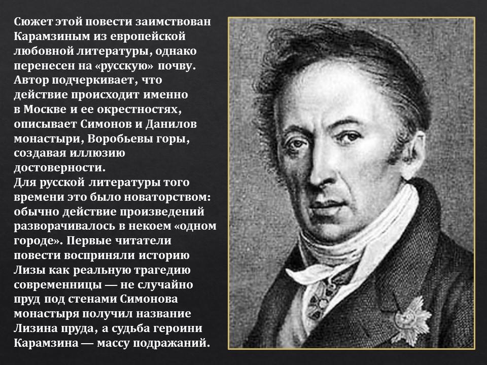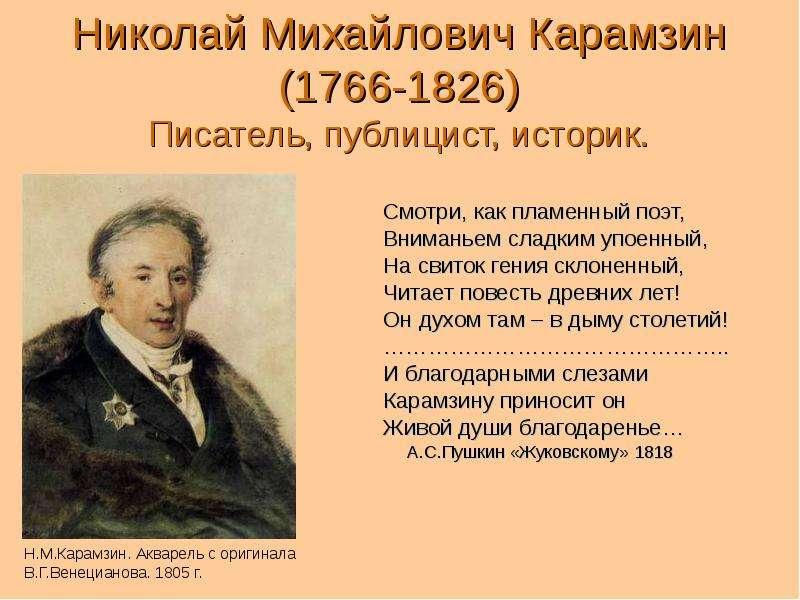 - Как литератор Карамзин дал русской литературе эталон независимости, создал образ мыслителя, ставящего собственное достоинство и неподкупность своих убеждений выше любых суетных соображений минуты.