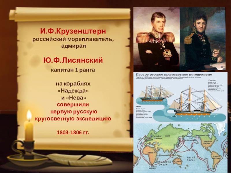 По инициативе Ивана Федоровича Крузенштерна в 1803 году началась Первая русская кругосветная экспедиция на кораблях «Надежда» и «Нева», результатом которой стали, прежде всего, выдающиеся научные достижения в области географии, океанографии, этнографии, минералогии, ботаники, зоологии. В экспедиции производились первые в истории науки метеорологические наблюдения.