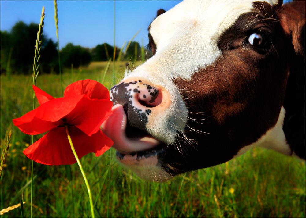 ответитьЭто корова из одного мультипликационного фильма. Ей волк подарил букет цветов, а она его (букет) сожрала.