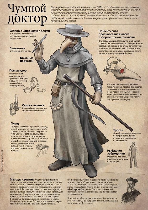ответитьАмуниция чумных докторов отвечала передовым достижениям медицины тех времён. А передовым достижением была теория миазмов (от греч. μίασμα — «загрязнение, скверна») — то есть ядовитых испарений, якобы являвшихся переносчиками болезней. Именно от них чумные доктора отгораживались длинной кожаной, масленой или вощёной одеждой; заодно она ещё и не пускала к телу блох, собственно, и переносивших возбудителя чумы. Клюв представлял собой, по сути, примитивный респиратор. Пахучие травы, которыми он был набит, долженствовали отгонять миазмы. И маскировать запах чеснока, который, чумные врачи жевали постоянно. А шляпа была всего лишь цеховым знаком принадлежности.