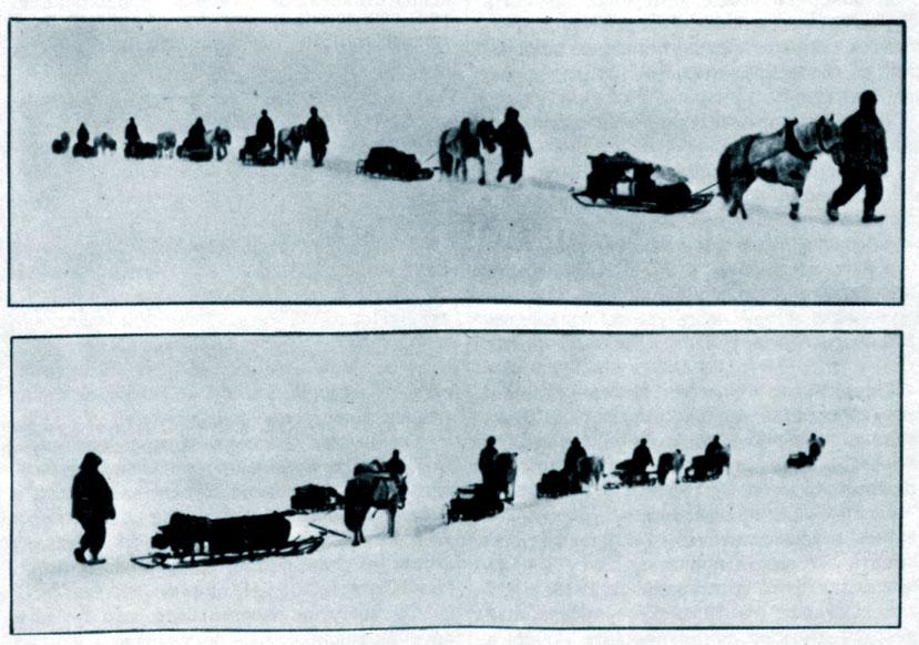 ... 1 ноября 1911 г. с мыса Эванса выступили тремя группами: на мотосанях, на пони, и на собаках. Но… мотосани сломались, пони отощали и их пришлось пристрелить, собак отправили назад в лагерь. Когда до цели оставалось 150 миль, 7 человек покинули основную экспедицию. К полюсу отправились впятером.
