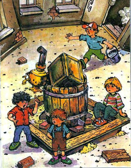 И мы эту бочку поставили на середку, и Костик сейчас же приволок с черного хода какой-то старый ничей самовар. Он его приделал к бочке, чтобы заливать туда горючее. ... Мы с Мишкой сделали внутреннее устройство и два окошечка по бокам: это были иллюминаторы для наблюдения. Андрюшка притащил довольно здоровый ящик с крышкой и наполовину всунул его в бочку. Я сначала не понял, что это такое, и спросил Андрюшку: