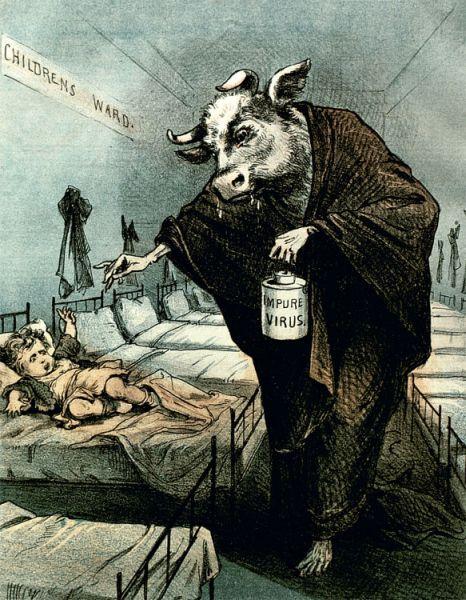 Именно Дженнер догадался, что перенесенная коровья оспа является защитой от человеческой, и что прививать нужно не натуральную, а животную оспу. Но прежде чем повсеместное примененяться, нововведение Дженнера должно было выдержать упорную борьбу с невежеством и предрассудками общества, травлей лжеученых и духовенства. Посыпались насмешки, появлялись карикатуры в газетах об «оскотинивании» прививаемых и т.д (10-11)