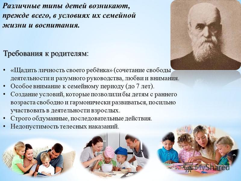 Однако физическое воспитание было только одним из направлений исследований Лесгафта. Его особенно интересовало воспитание ребёнка в семье и в школе. По его мнению, человек в семье должен развиваться, и именно из адекватного семейного воспитания растут такие качества, как добро, отзывчивость, нравственность.