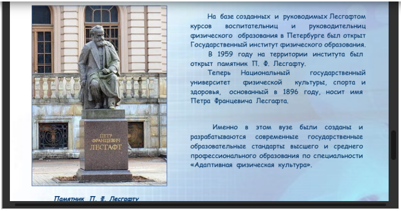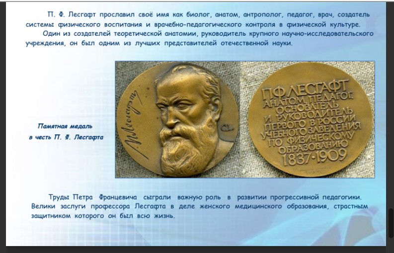 В середине 1880-х годов в Петербурге Лесгафт создаёт двухгодичные «Курсы воспитательниц и руководительниц физического образования» ДЛЯ ДЕВУШЕК! (За женское медицинское образование он боролся всю жизнь, жертвуя даже карьерой) Они стали прообразом современных высших учебных заведений физической культуры. Летом 1919 года в СССР, стране, где царили голод и разруха, правительство создает на базе «Курсов» первый в стране Государственный институт физического образования (ГИФО). Новому институту присвоили имя П.Ф. Лесгафта.