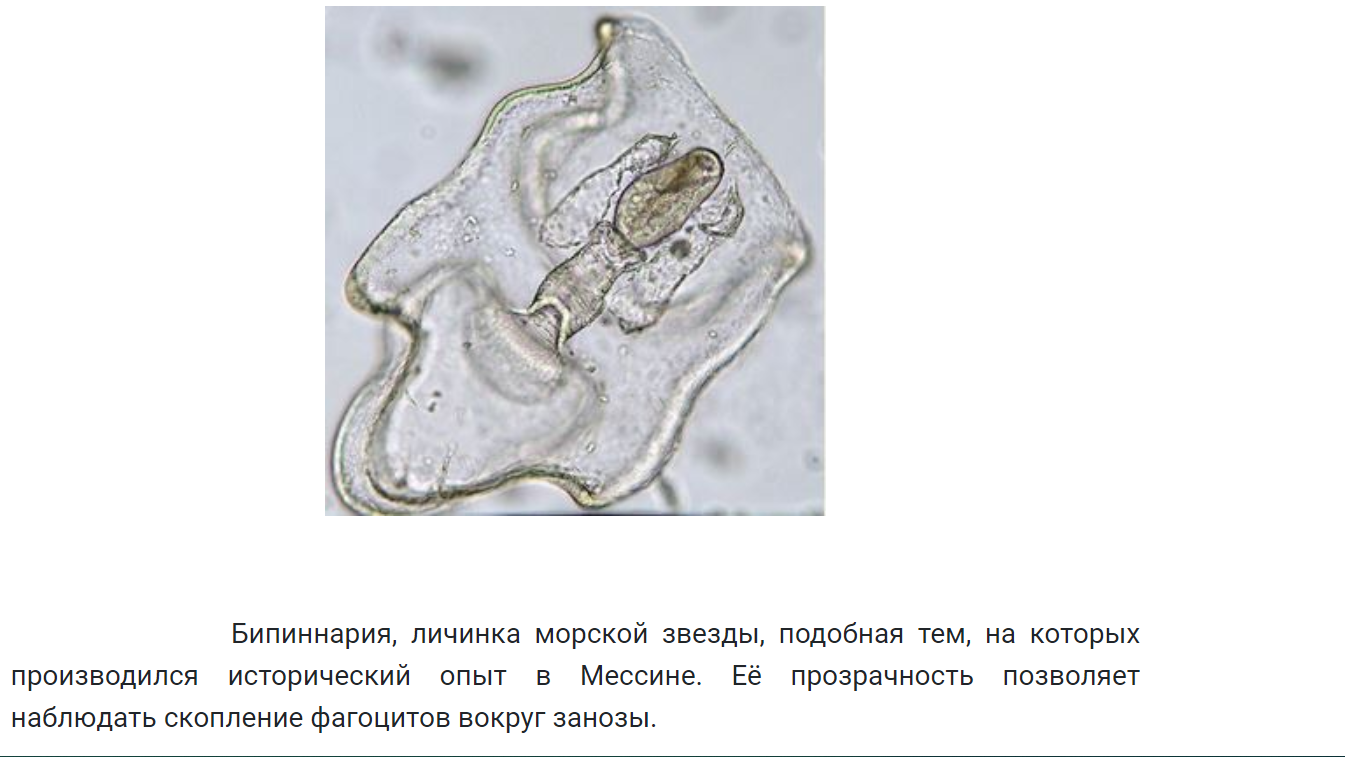 Их личинки были прозрачны, и Мечников обратил внимание на странные блуждающие клетки внутри них, передвигающиеся подобно амебам. Не раз ученый наблюдал, как эти клетки «спешили» к вводимым внутрь кусочкам кармина или втыкаемой щепочке, обволакивали их и пожирали.