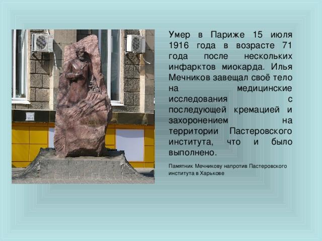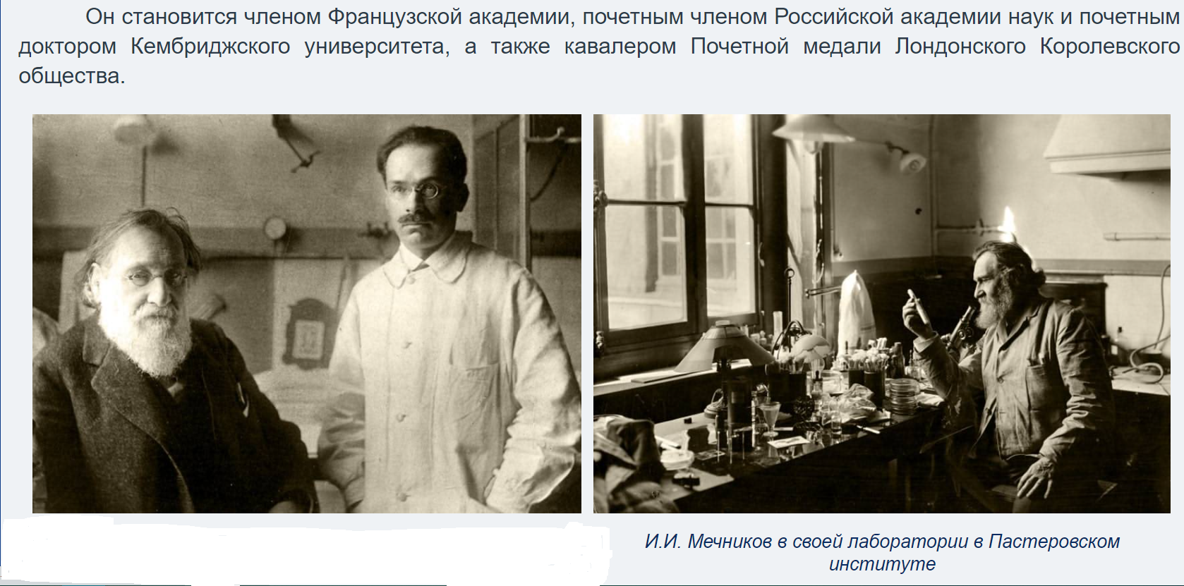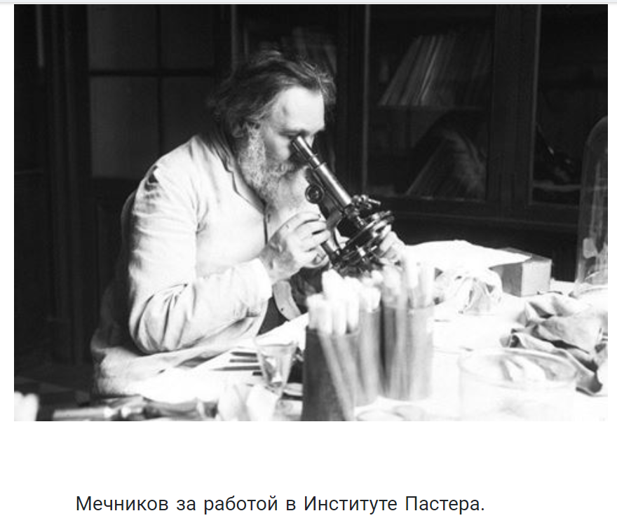 На основе этого открытия Мечников создал фагоцитарную теорию иммунитета - что защищают нас от микробов блуждающие клетки, пожирающие их, - и был удостоен за нее Нобелевской премии. Его пригласили в Париж для работы в институте Пастера (см. кросс автора 28.10).
