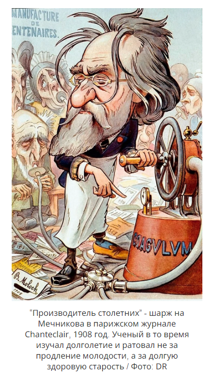 Поэт Сологуб все понял правильно: Мечникова много лет занимали вопросы старения. Сначала ученый предполагал, что мы стареем и умираем преждевременно из-за артериосклероза, чьей главной причиной тогда считался сифилис. Мечников и Ру занялись исследованием сифилиса, истратив на это все полученные ими премии и награды (обезьяны для опытов стоили дорого) В результате огромного количества экспериментов была изобретена каломельная (ртутная) мазь, спасшая тысячи жизней от этой страшной, считавшейся до сих пор неизлечимой болезни.