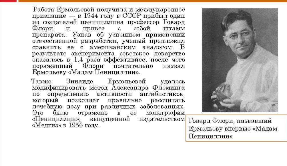 В январе 1944 г. в Москву приехал оксфордский профессор Флори с собственными образцами. Анализ показал, что пенициллин Ермольевой действовал гораздо эффективнее, но несмотря на это, в 1945 году Нобелевский комитет наградил премией по физиологии и медицине именно Говарда Флори.