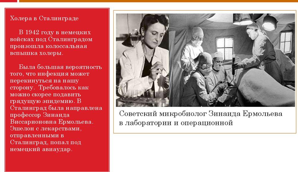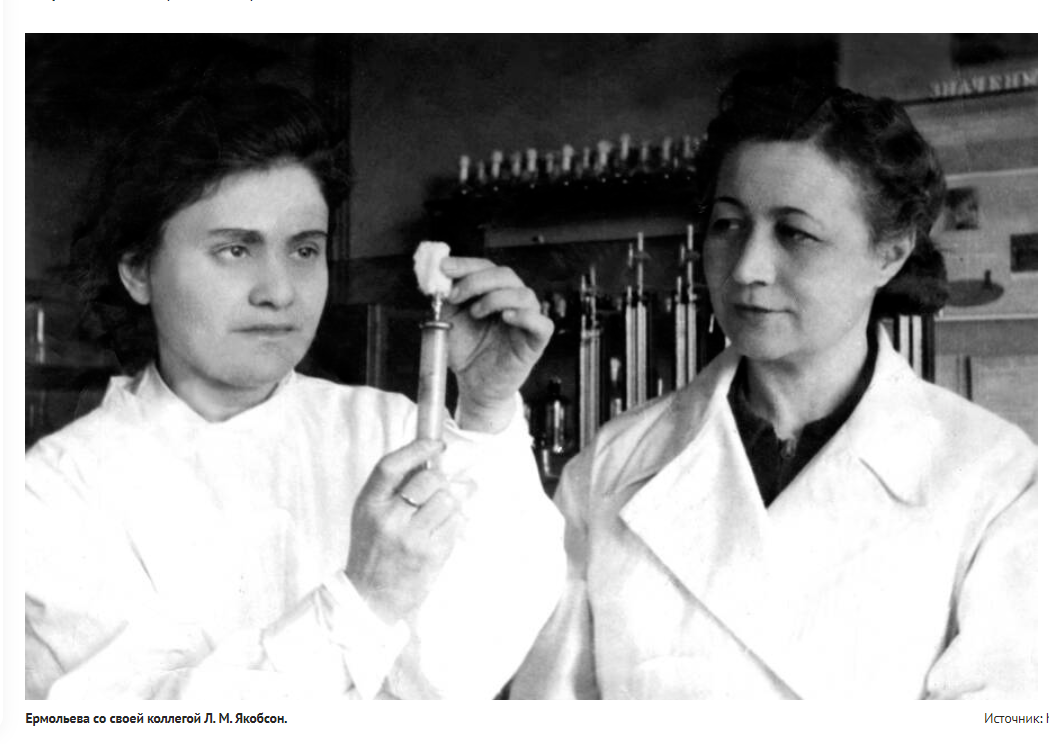 Благодаря опыту Ермольева сумела остановить эпидемию холеры в разрушенном Сталинграде в 1942 г. Эшелон с бактериофагом разбомбили, и женщина организовала в подвале разрушенного дома импровизированную лабораторию. Хватило и на население, и на армию! (Благодаря этому не было остановлено наступление советских войск)