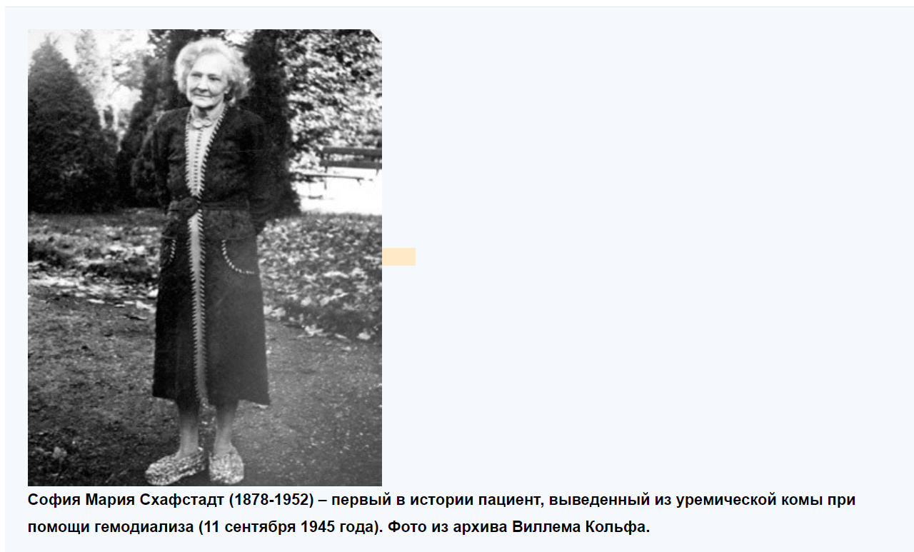Первые попытки диализа были неудачными. Но 17 марта 43 г. первой пациентке удалось принести облегчение. Правда ненадолго, всего на месяц, но этот день считается днем рождения искусственной почки.