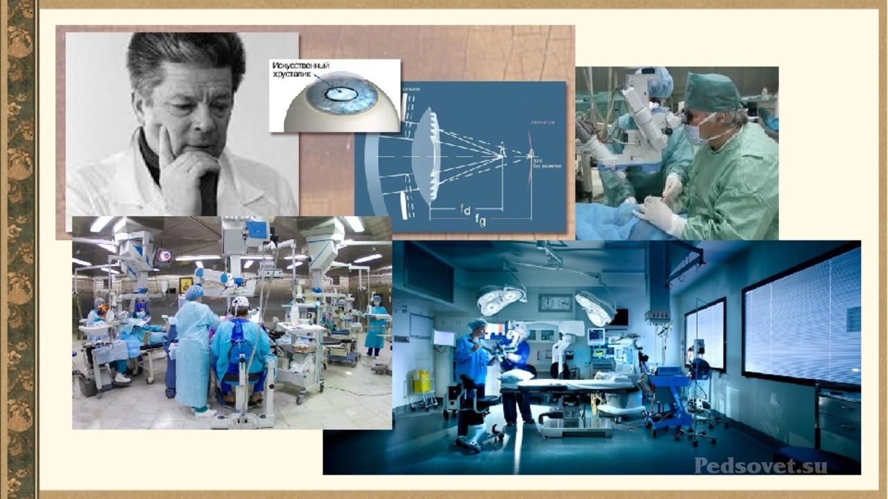 ... Первая статья о молодом подающем надежды враче появилась в чебоксарской газете в 1960 г. Федоров, после года подготовки, сделал редкую операцию - вживил искусственный хрусталик в глаз 12-летней Лене Петровой, которая из-за врожденной катаракты с двух лет не видела правым глазом. Линзу из пластмассы для точил слесарь-лекальщик Мильман. (Линз нужной чистоты и прозрачности тогда еще не было). Часовщик Смирнов смастерил пресс для изготовления дужек, закрепляющих линзы, театральный художник Венценосов - микросверла, ленинградский механик Лебедев - специальный токарный станок. Операция прошла успешно - девочка прозрела.