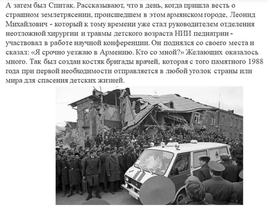 ... «в Беслане сложилась ситуация, когда Леонид Михайлович предотвратил гибель сотен детей, которые оставались в заложниках. Хирург признается, что не помнит, какие слова говорил тогда и как убедил оставить людей в живых, но счастлив за благоприятный исход»